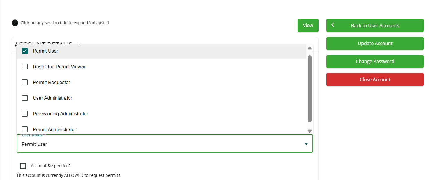 4. Click the “User Roles” field, select the roles to assign to the user, and then click “Update Account.”