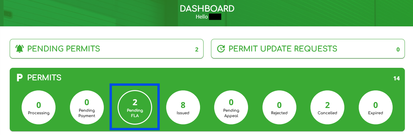 1. Log in as a user with the “Permit Administrator” role, then click on the “Pending FLA” widget as shown below.
