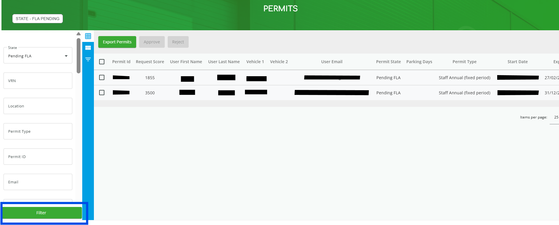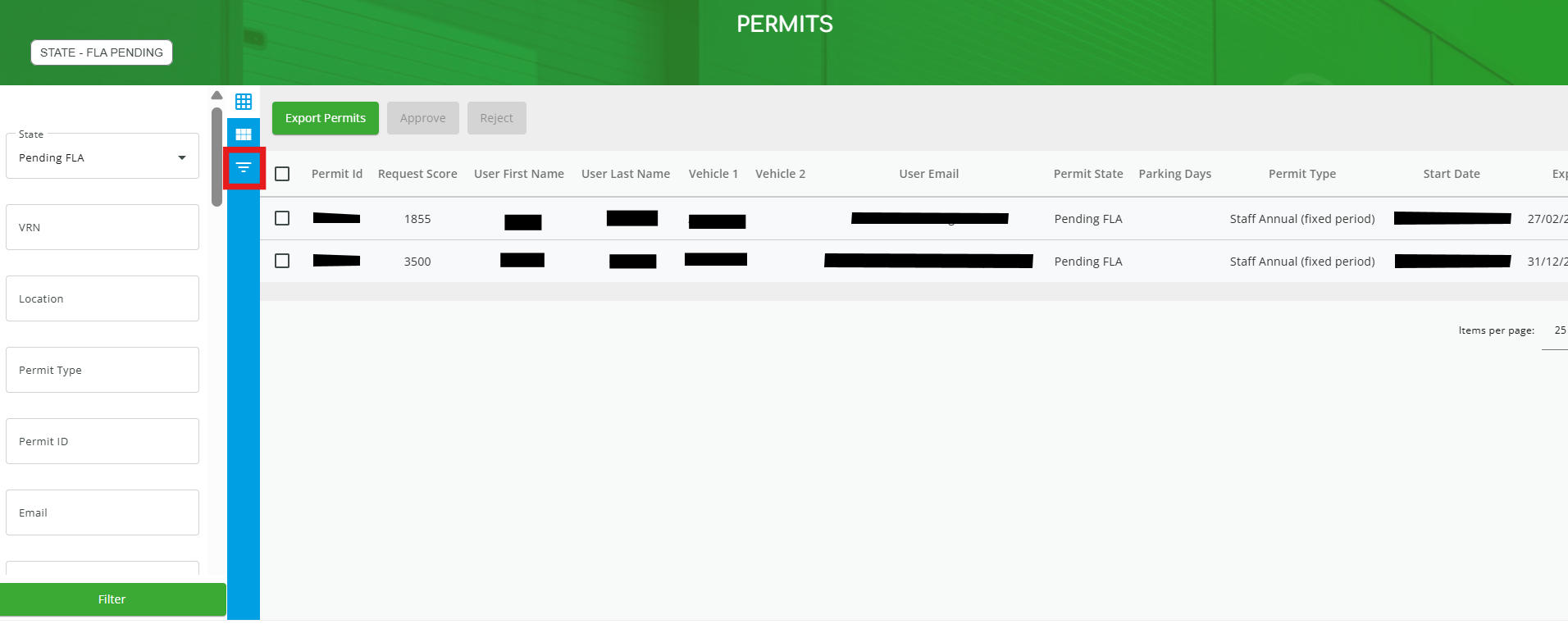 2. If needed, you can filter your permits by clicking the icon highlighted in red below. (Note: Click the icon again to close the filter section.)