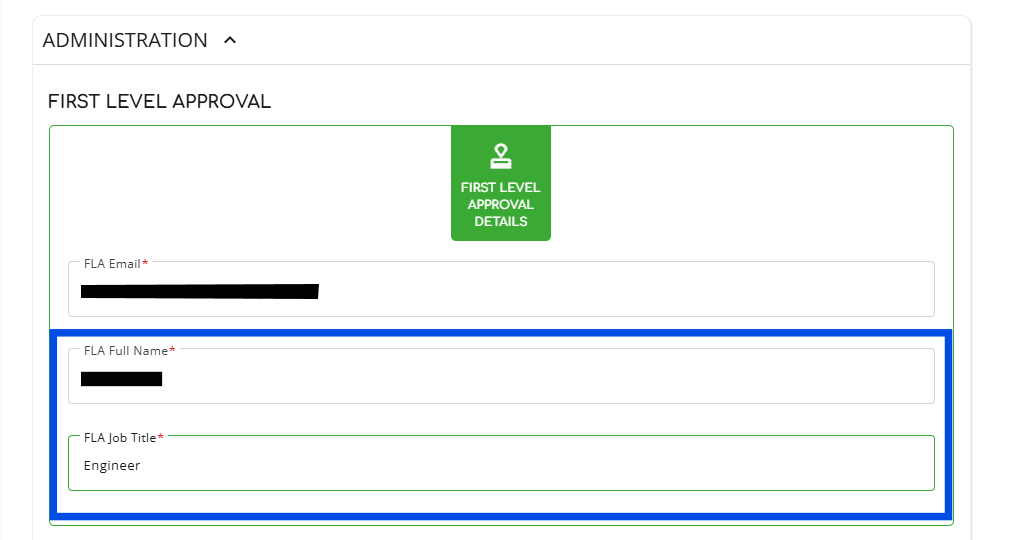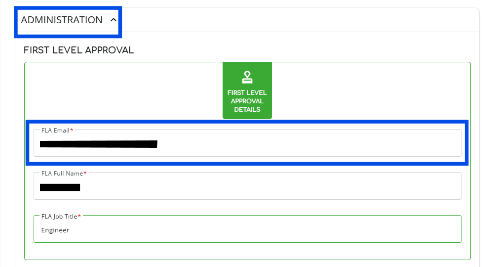 6. Scroll down to the “ADMINISTRATION” section, click on the “FLA Email” field and enter the email address of the person you want to approve.